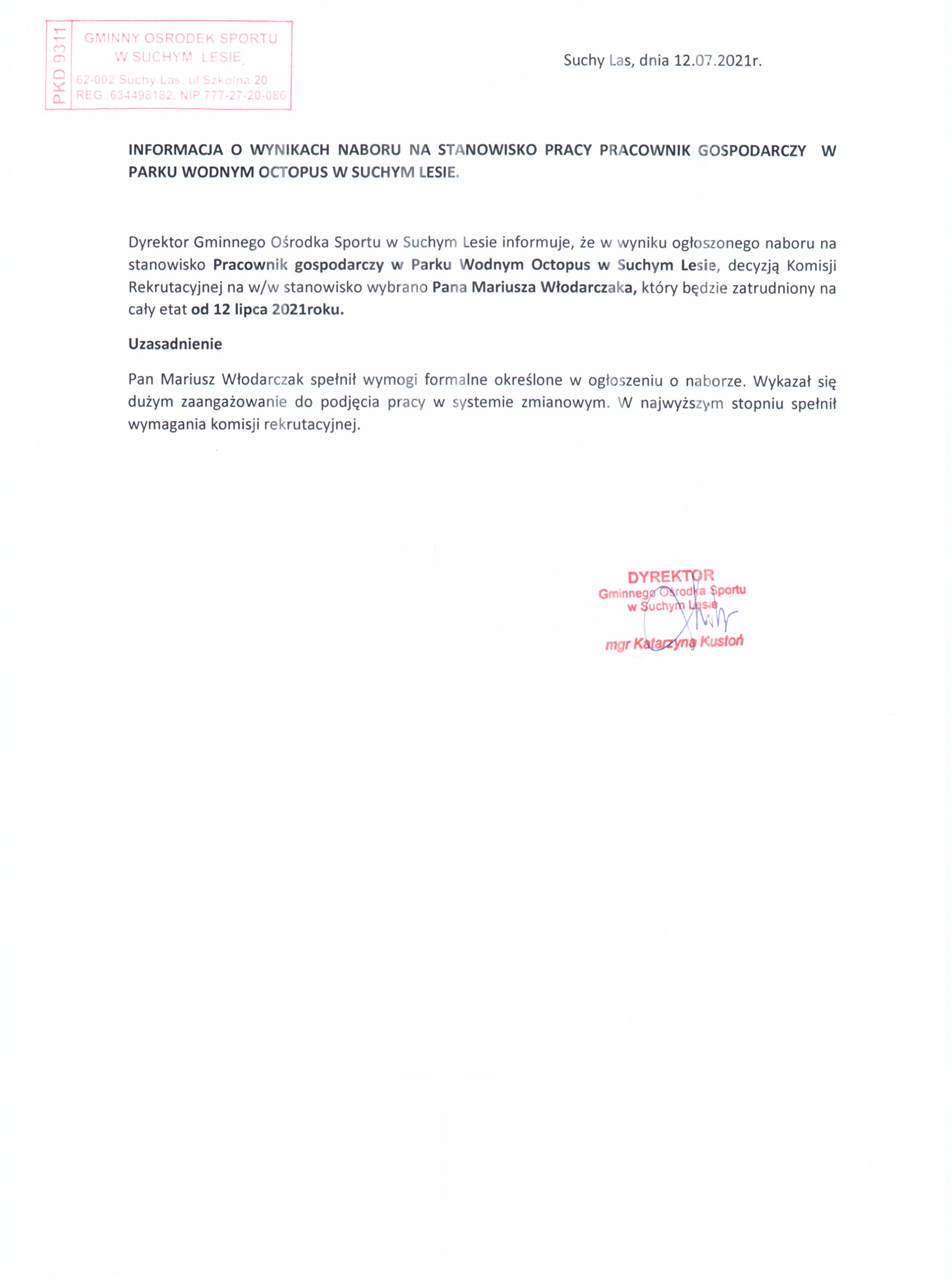 Informacja o wynikach naboru na stanowisko Pracownik gospodarczy