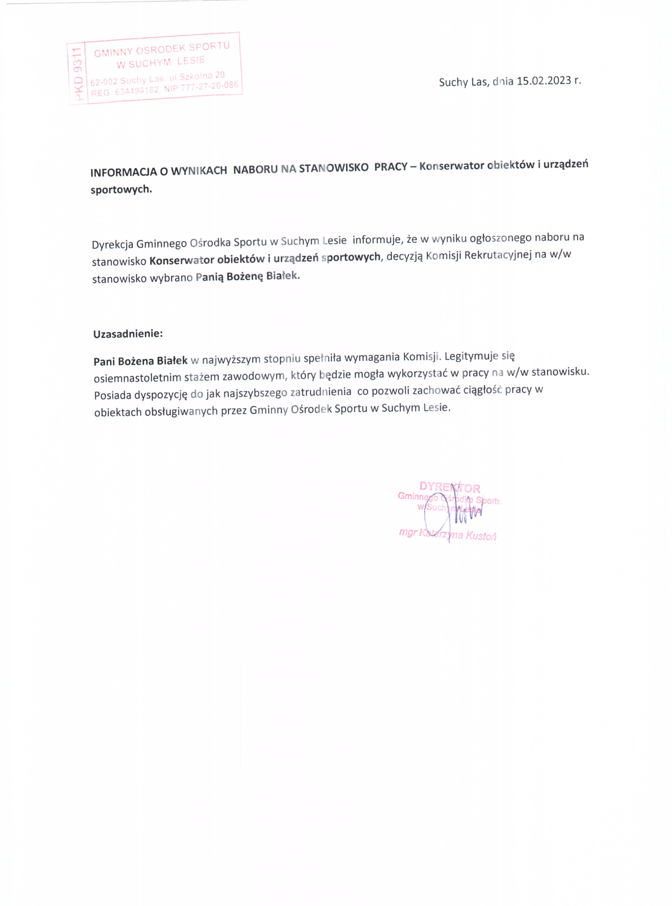 Informacja o wynikach naboru na stanowisko pracy: Konserwator obiektów i urządzeń sportowych