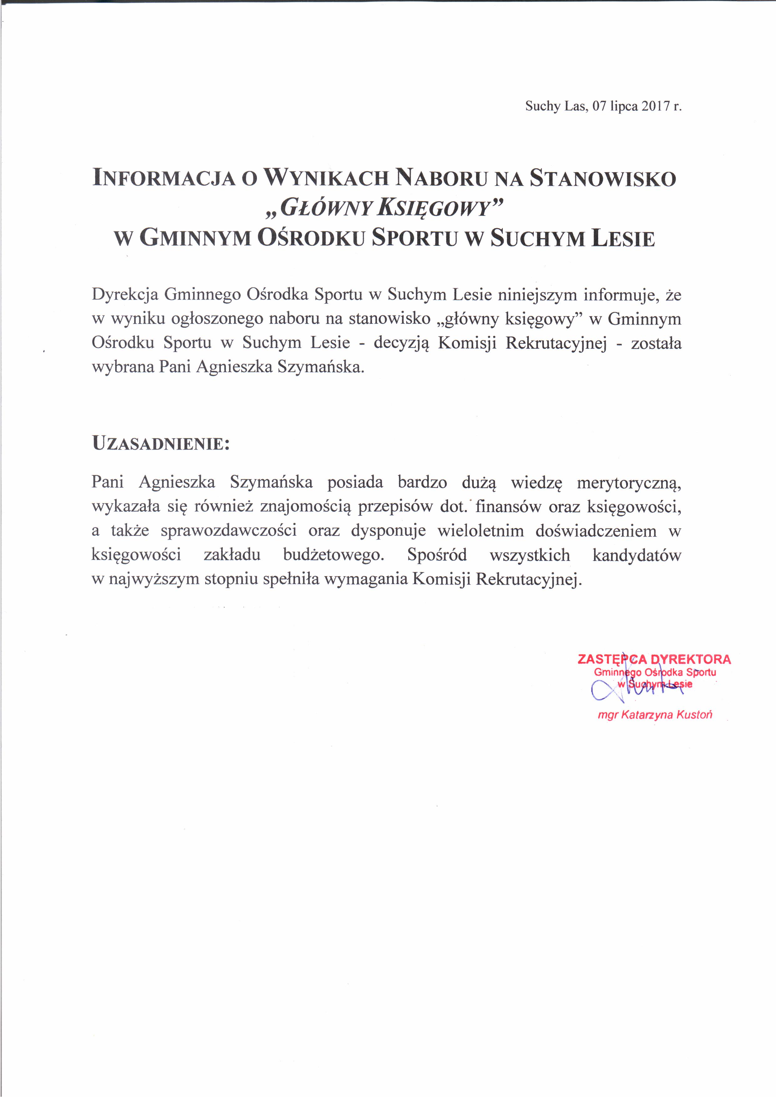 Wyniki naboru na stanowisko Głównego Ksiegowego w Gminnym Ośrodku Sportu w Suchym Lesie