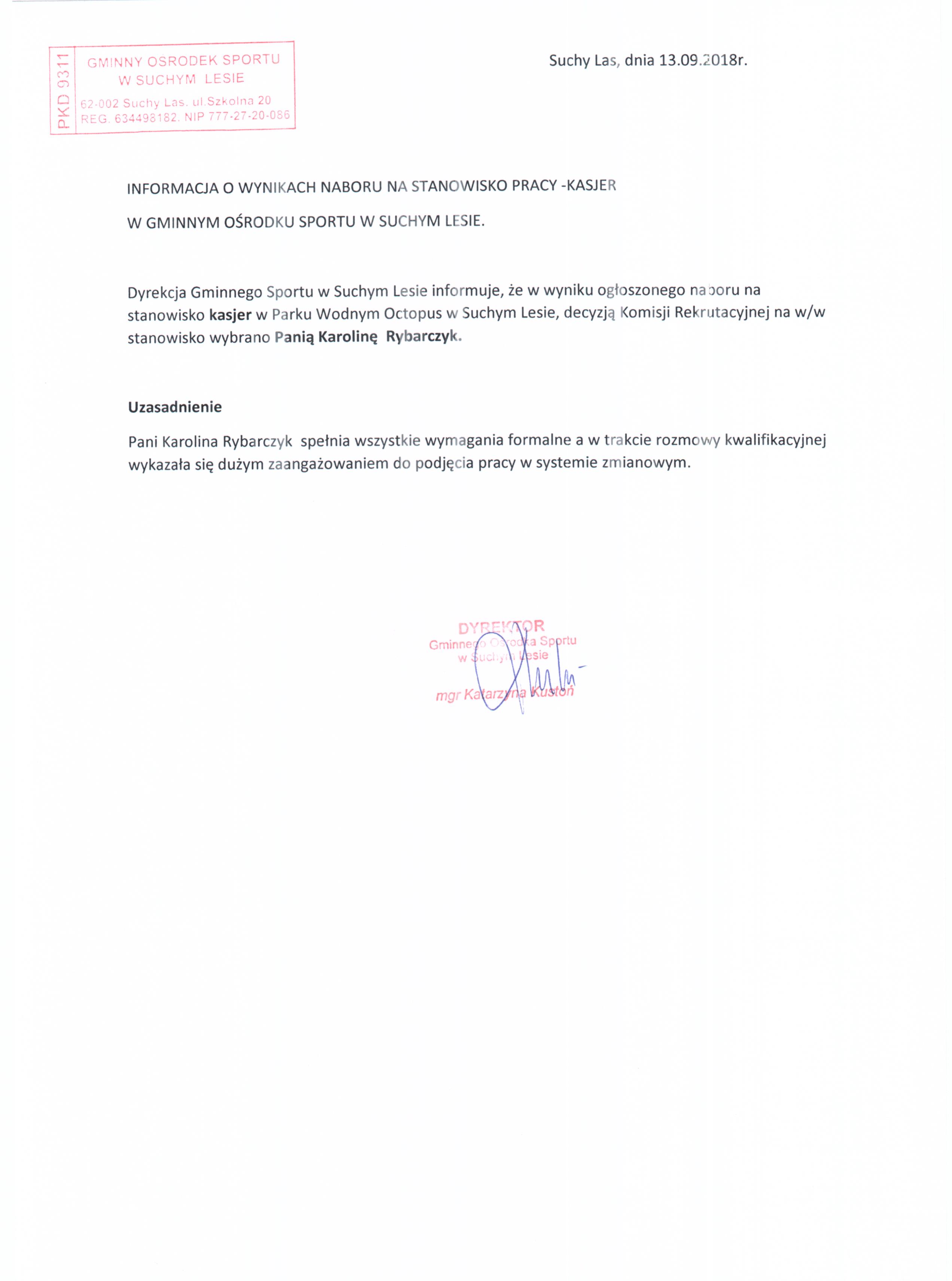Informacja o wynikach naboru na stanowisko KASJER w Parku Wodnym Octopus