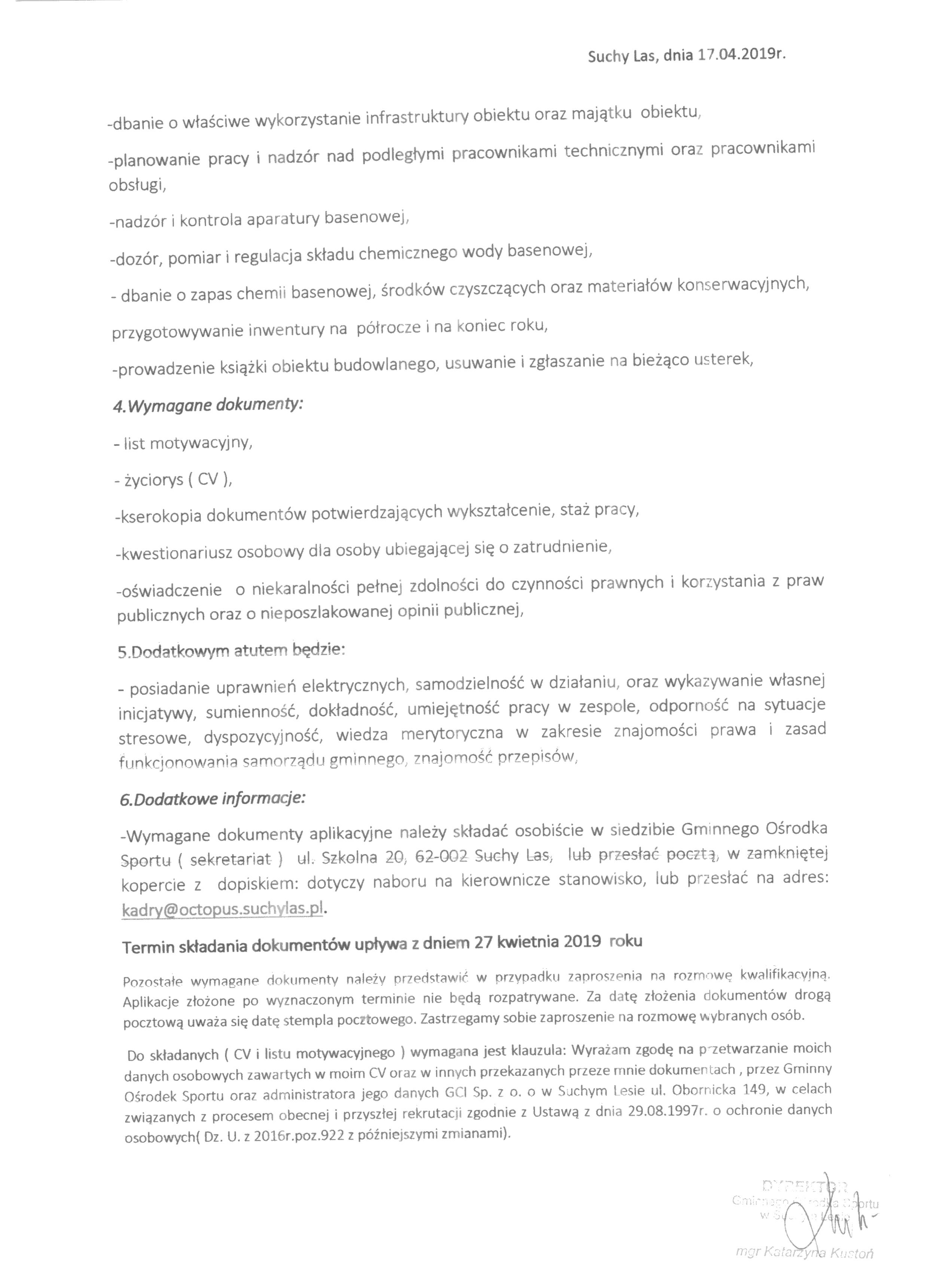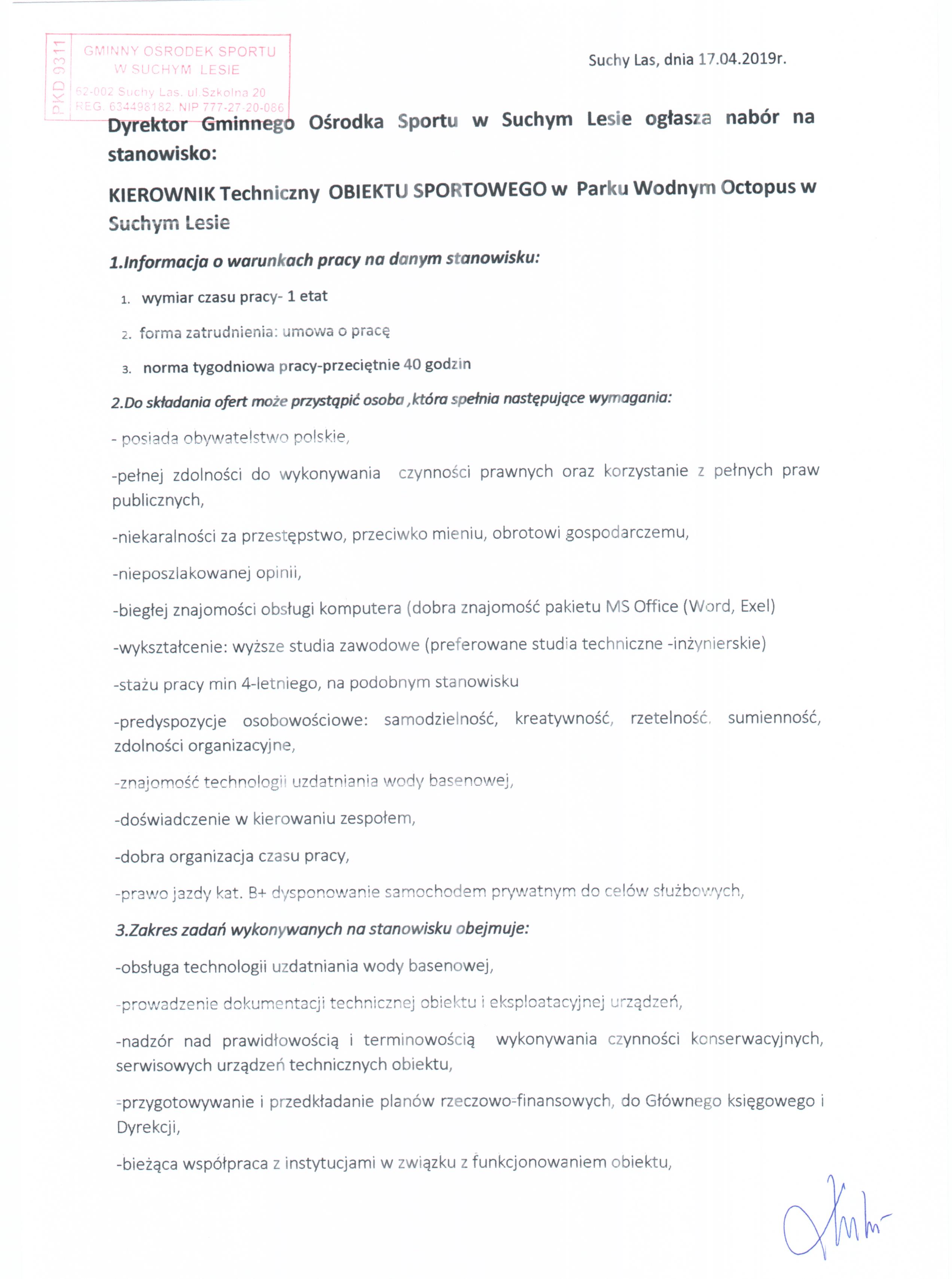 Nabór na stanowisko: KIEROWNIK Techniczny OBIEKTU SPORTOWEGO w Parku Wodnym Octopus w Suchym Lesie