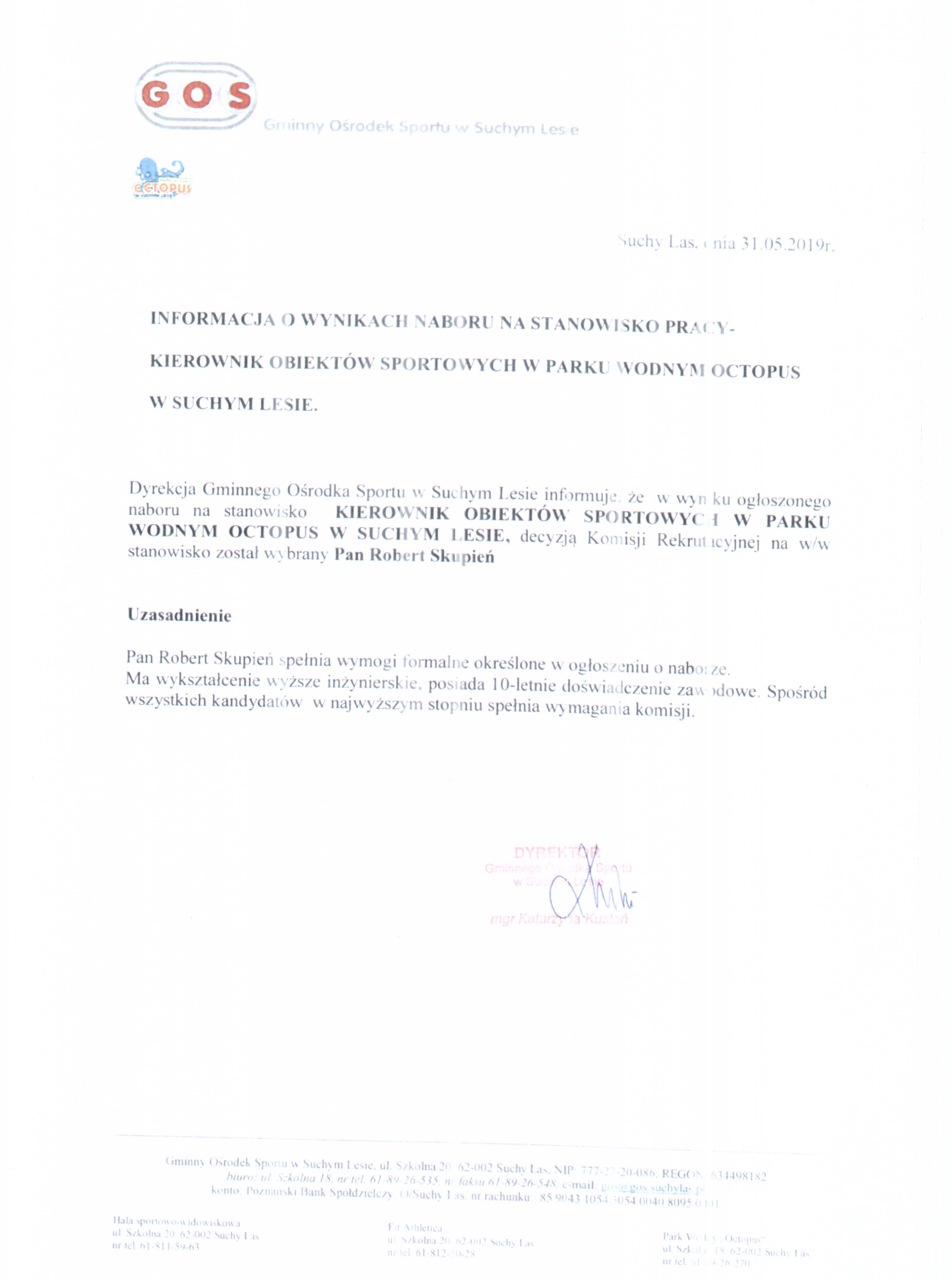 Informacja o wynikach naboru na stanowisko KIEROWNIK