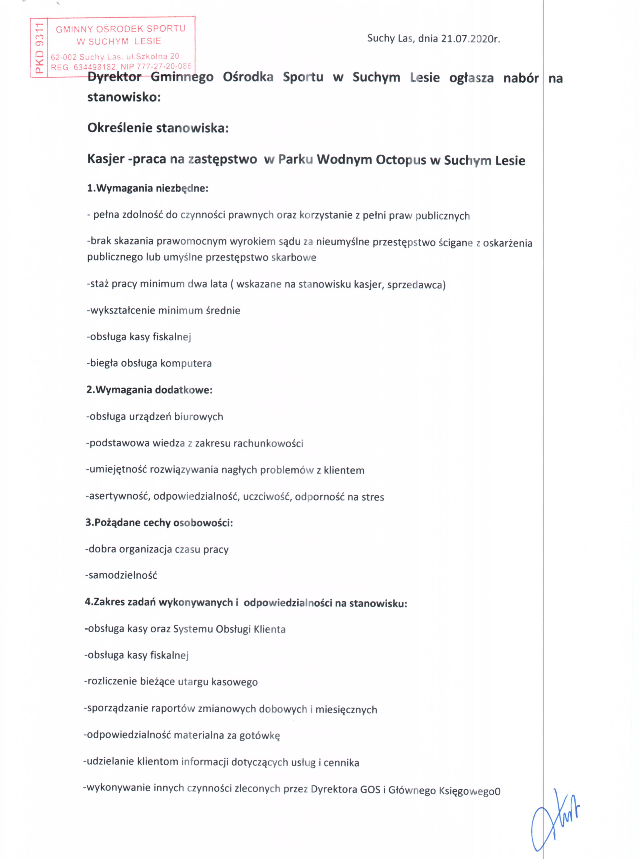 Nabór na stanowisko Kasjer w Parku Wodnym Octopus w Suchym Lesie