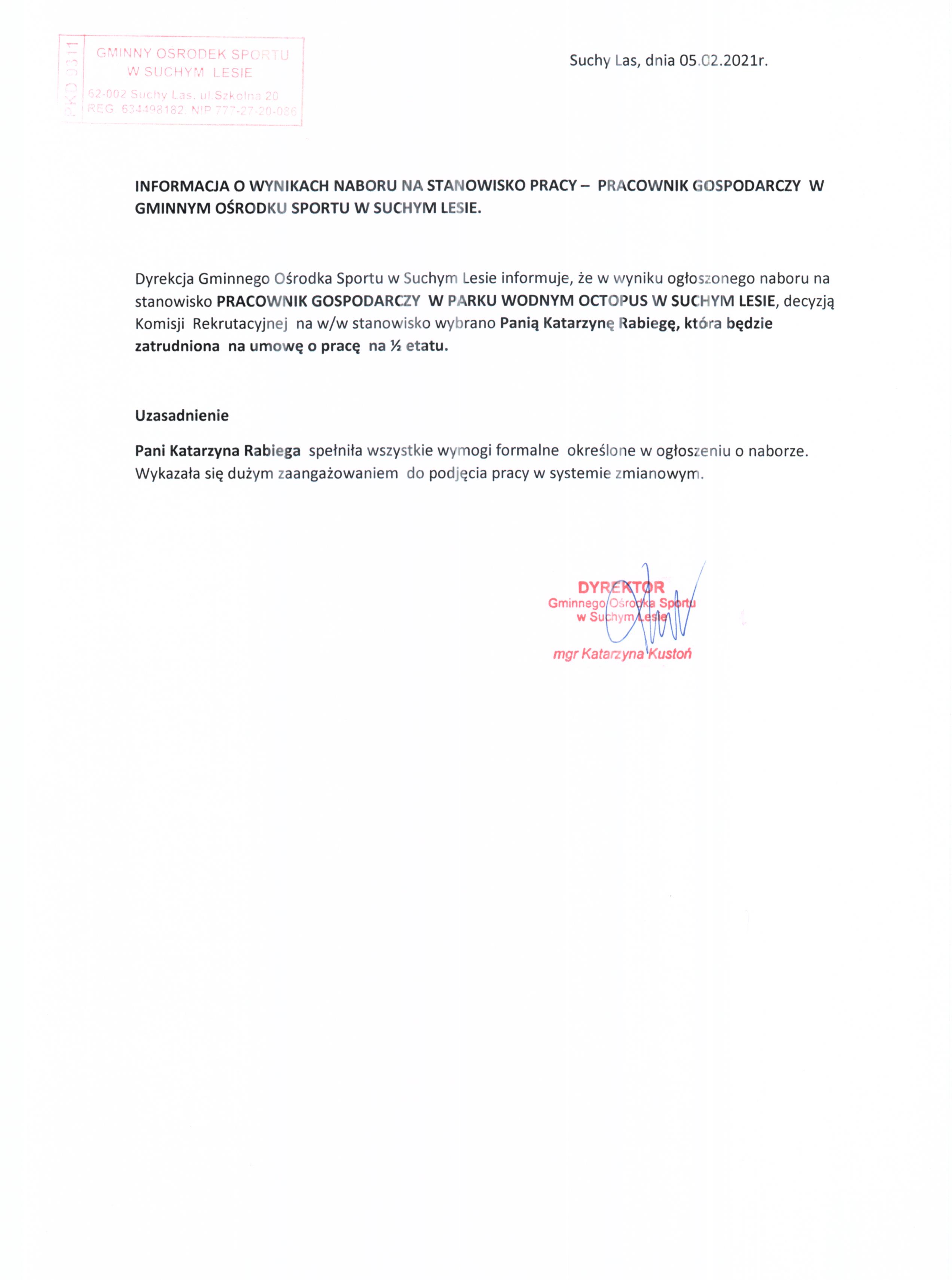 Informacja o wynikach naboru na stanowisko Pracownik gospodarczy