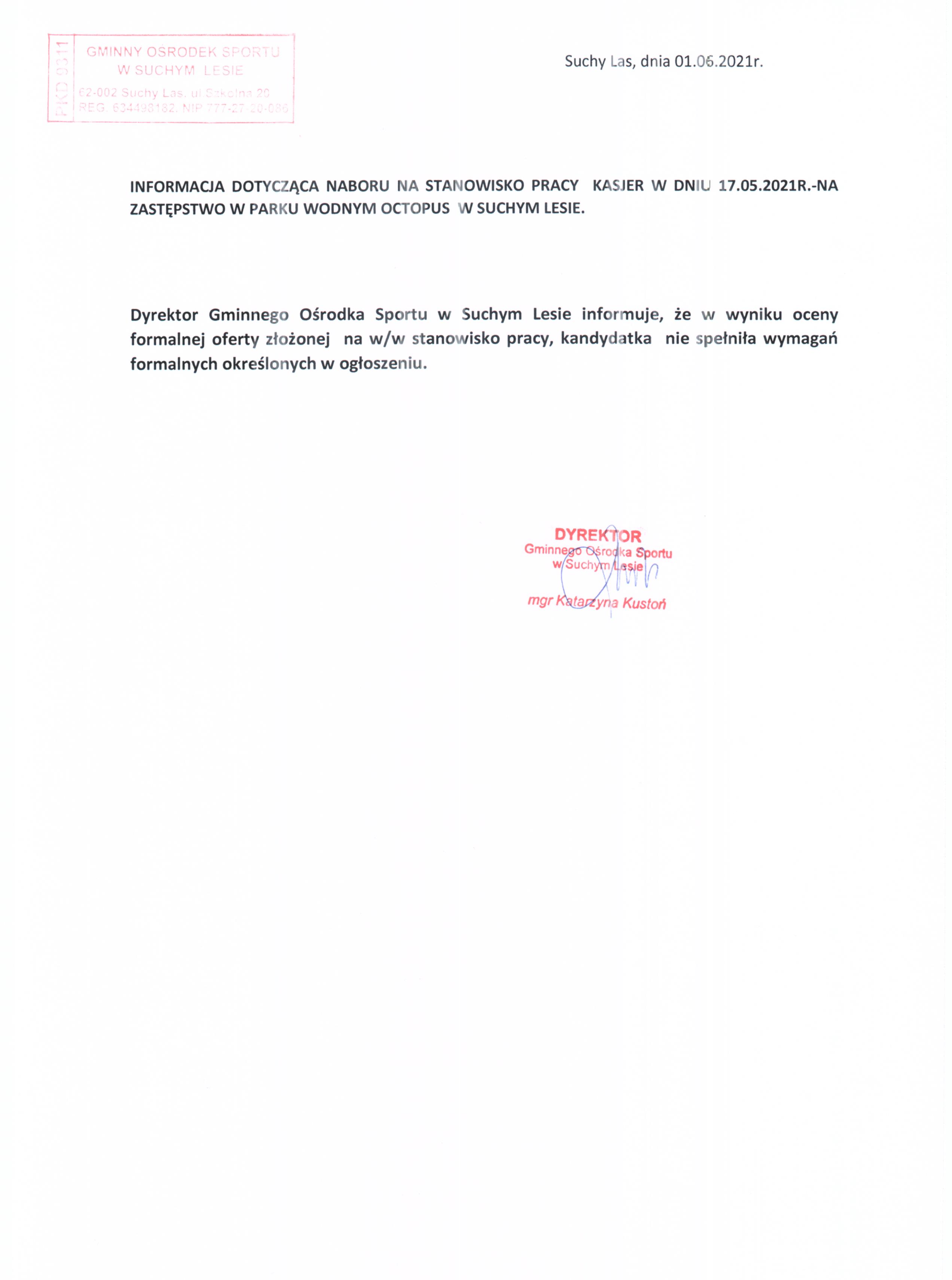 Informacja dotycząca naboru na stanowisko pracy Kasjer
