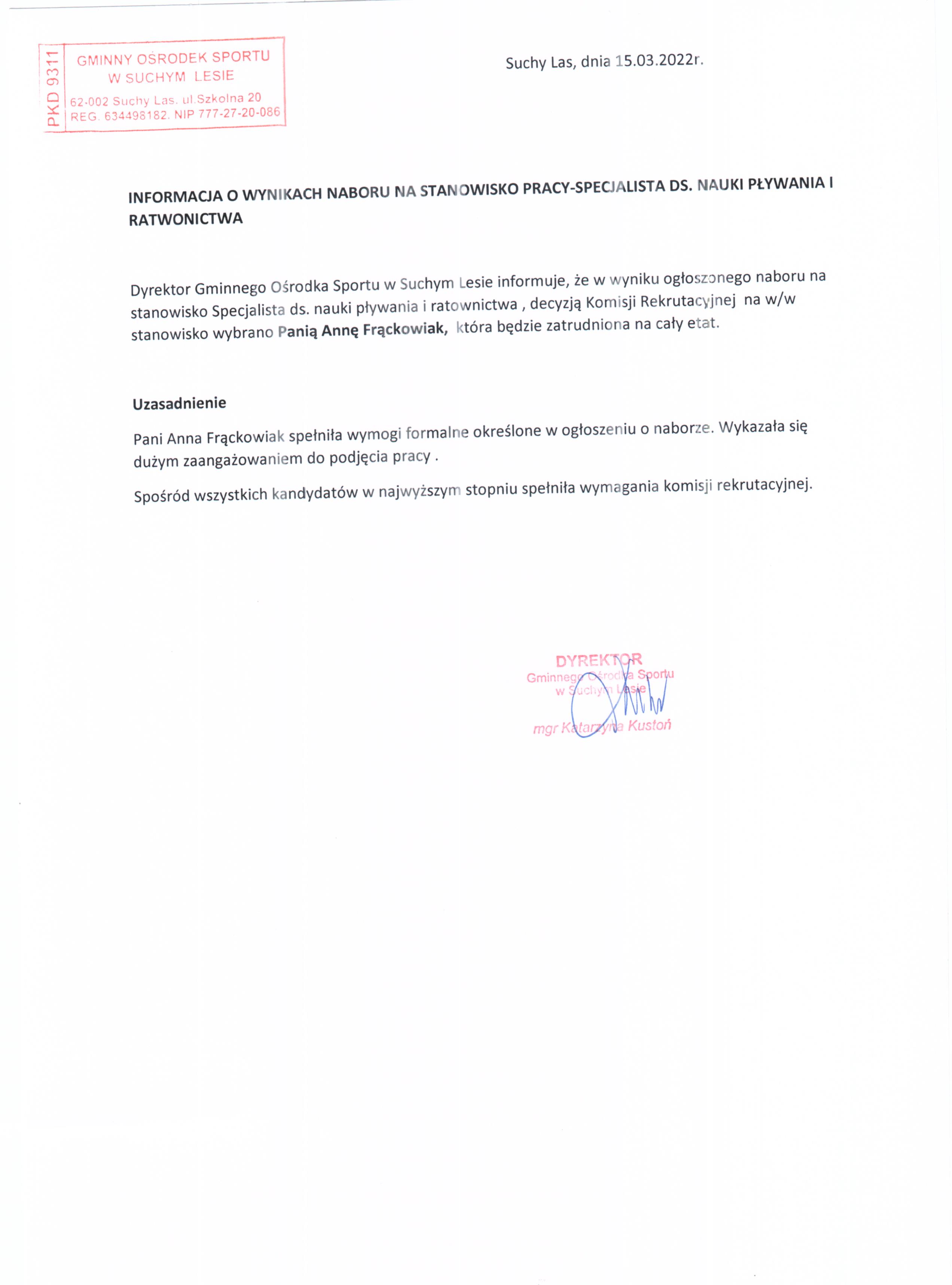 Informacja o wynikach naboru na stanowisko pracy SPECJALISTA ds. NAUKI PŁYWANIA I RATOWNICTWA