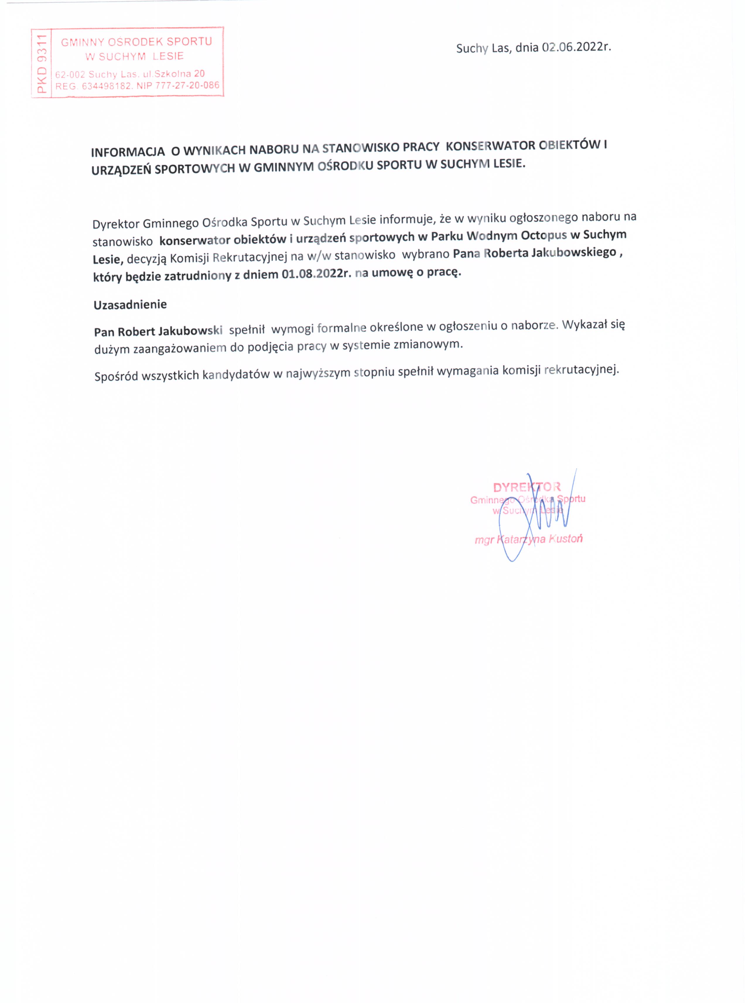 Informacja o wynikach naboru na stanowisko pracy: KONSERWATOR obiektów i urządzeń sportowych w GOS