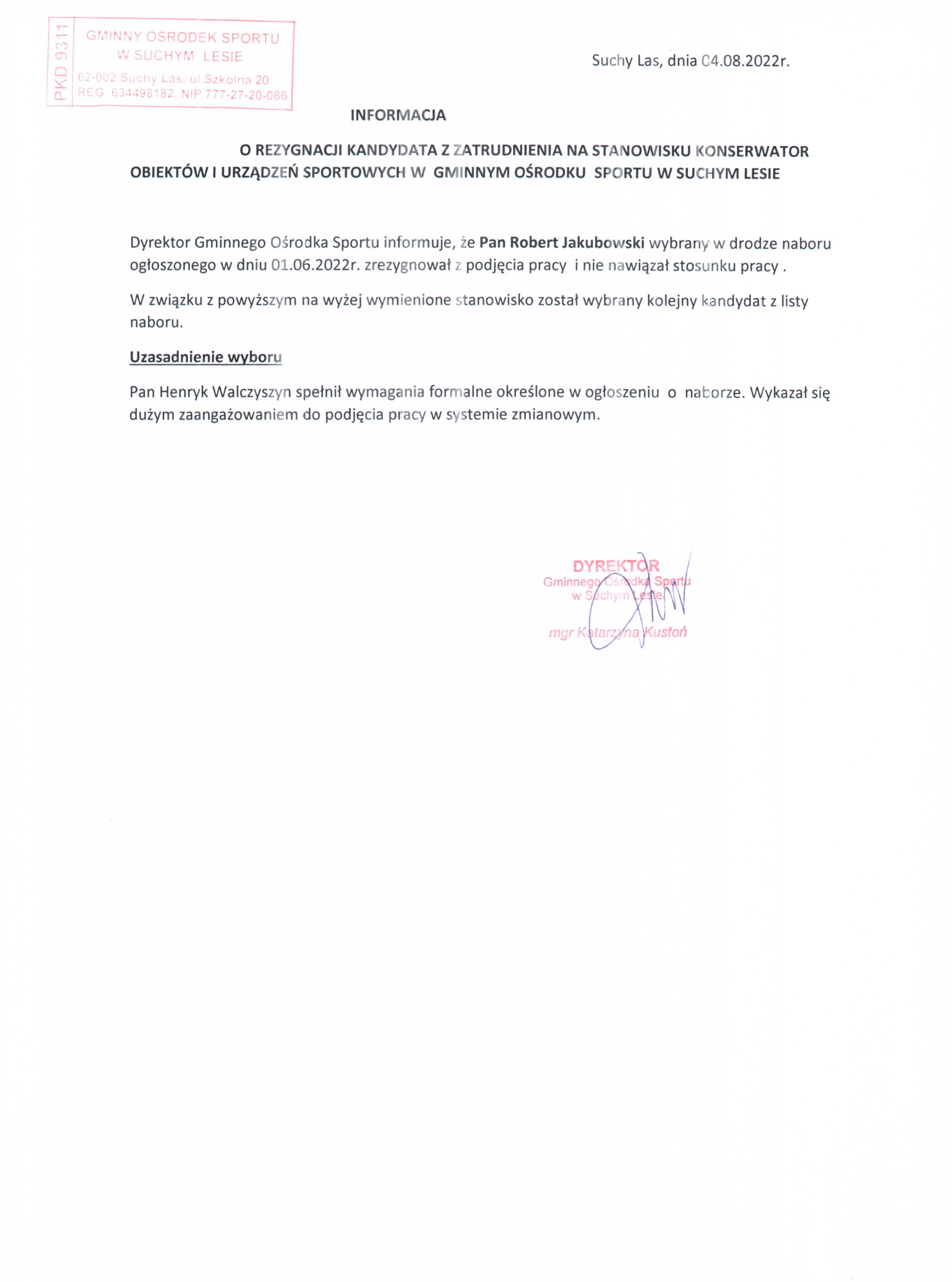 Informacja o wynikach naboru na stanowisko pracy: KONSERWATOR obiektów i urządzeń sportowych w GOS