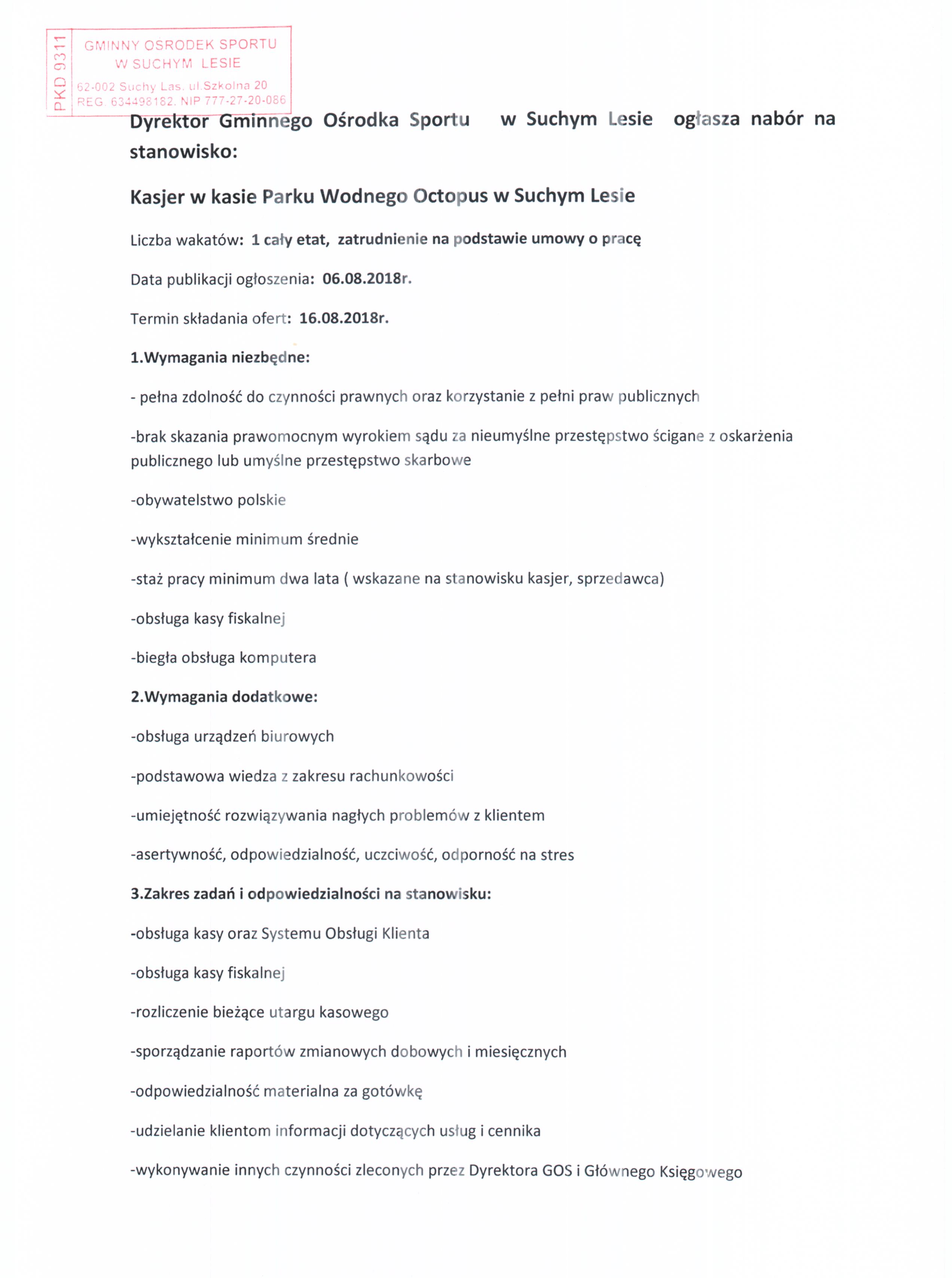 Nabór na stanowisko: KASJER w kasie Parku Wodnego Octopus w Suchym Lesie